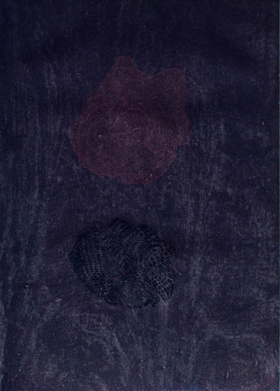 Combining the 'invisible ink' with burn drawing from reverse. Object apears to be concealed within or beneath the page, pushing through from behind. A withdrawn object.